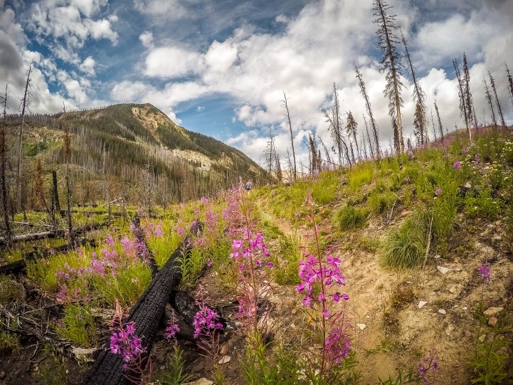 From Gates Park we began our second big climb of the day, this time a long 8 mile, several thousand foot slog up Red Shale Creek. It now was mid-morning and warm. Again we spread out in little groups of threes or fours. The Red Shale drainage burned in 2013, during the first RATBOB run. Unlike the fire remnants in the run down from Headquarters Pass, these scars still are fresh. Trees jet black with soot and ashy soil underfoot. But the open vistas were great and there was pink fireweed everywhere. I had worried that this drainage would be hot and dry, but the more we climbed the more lush it became.